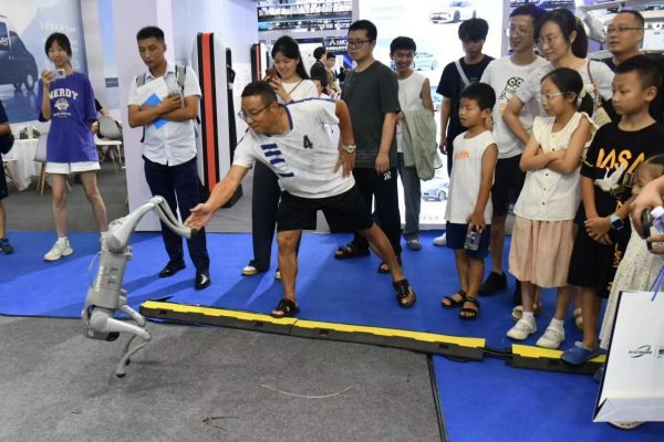 在展会现场,市民与机器人开心互动。中新社记者张浪摄